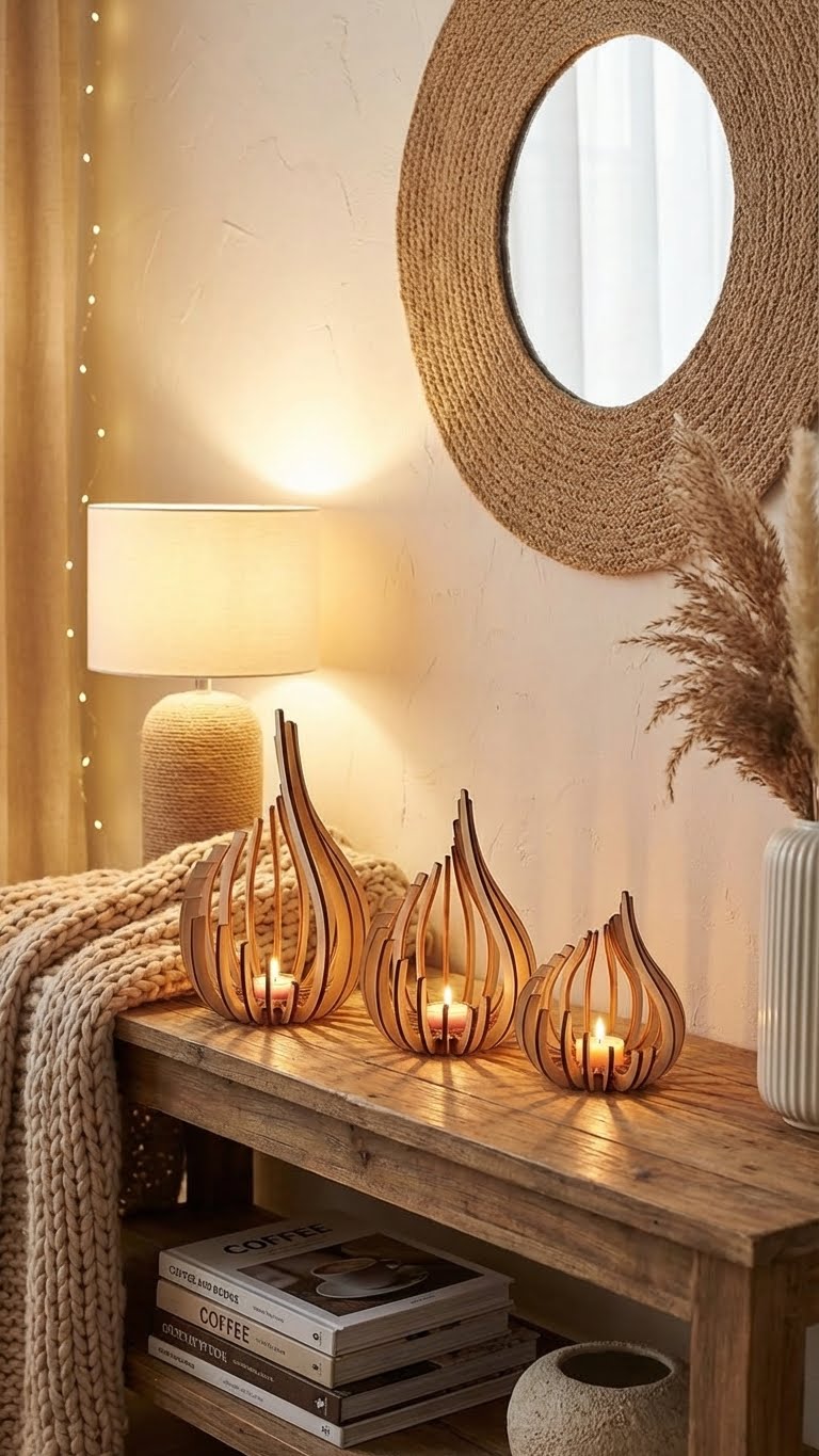 L'âme du bois s'éveille. Ces bougeoirs naturels tissent un murmure de lumière. Une étreinte chaleureuse, la touche naturelle pour un cocon douillet. Art de vivre authentique.
