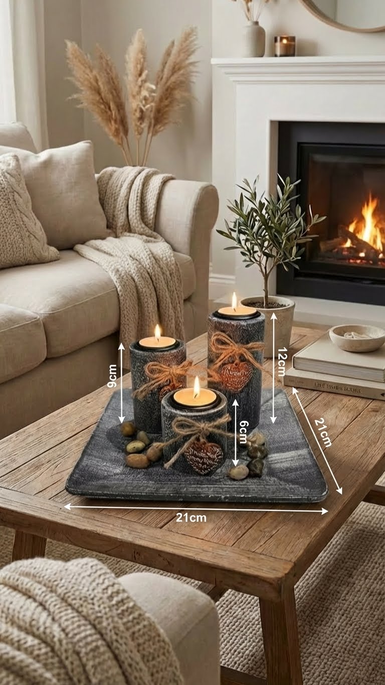 Cet ensemble est un véritable trésor de Provence, comprenant trois délicats bougeoirs en bois gris vintage, un élégant plateau décoratif orné de petits galets, et un charmant cœur sentimentale sur chaque bougeoir. Chaque pièce est curée pour créer une ambiance intemporelle.