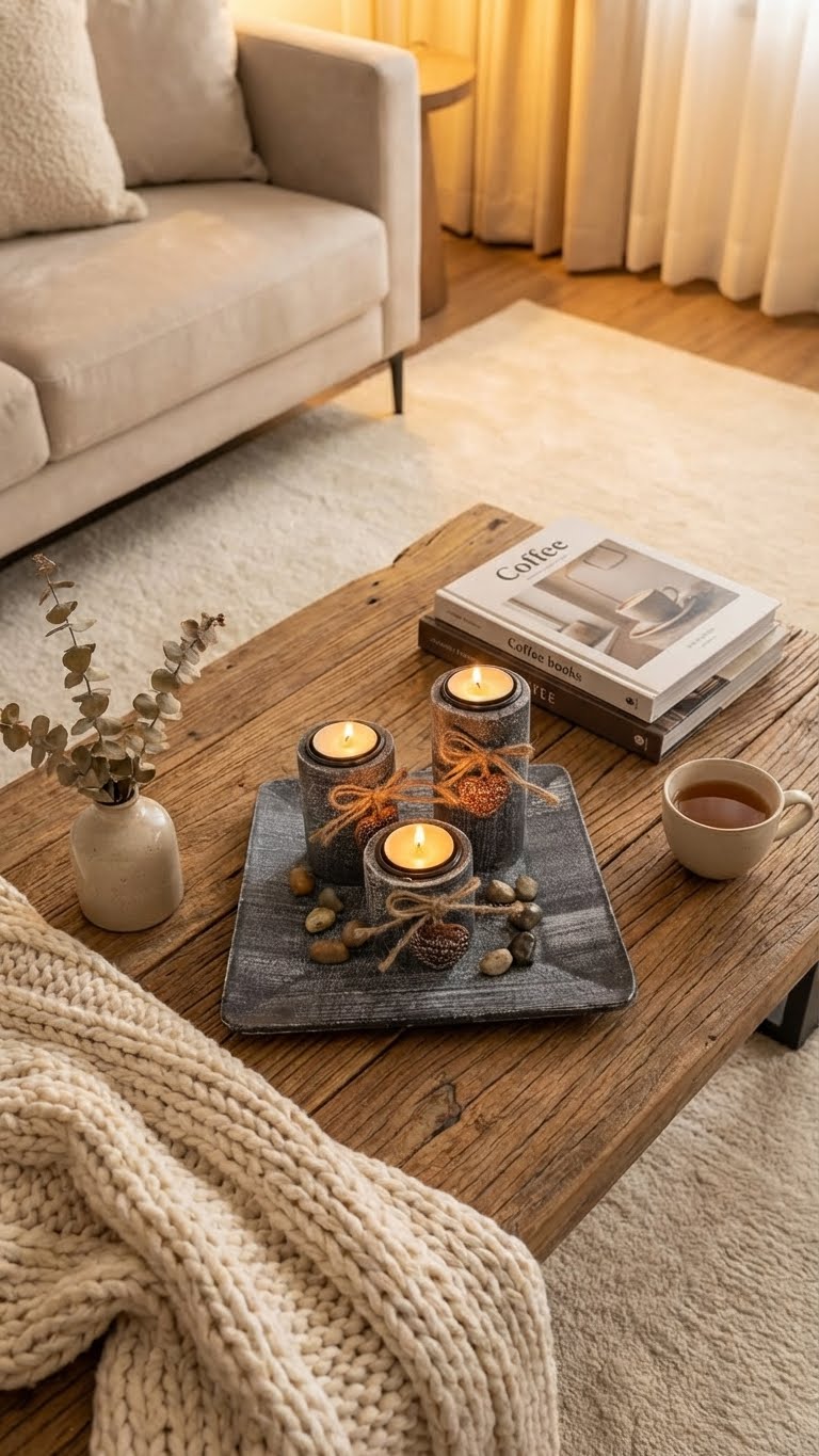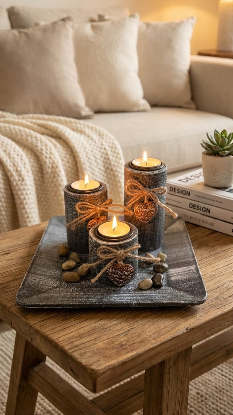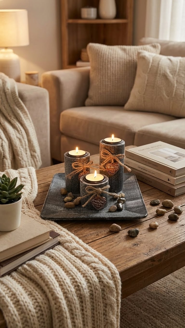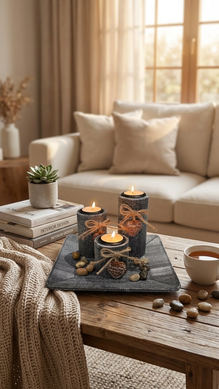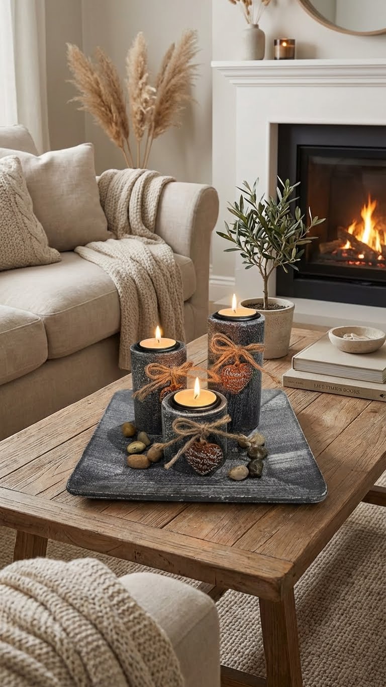 Un plateau décoratif, méticuleusement pensé et parsemé de galets choisis, compose un tableau d'ambiance, prêt à diffuser sa chaleur et son charme sans le moindre effort.