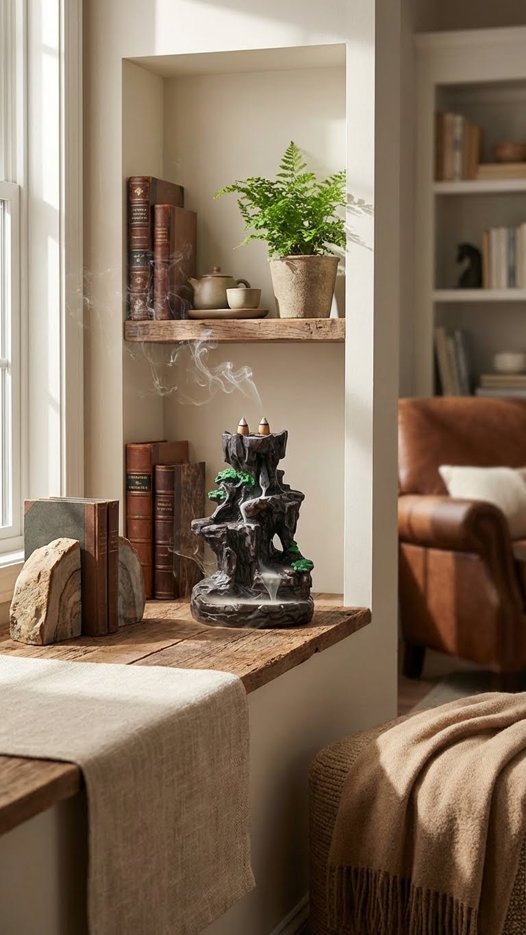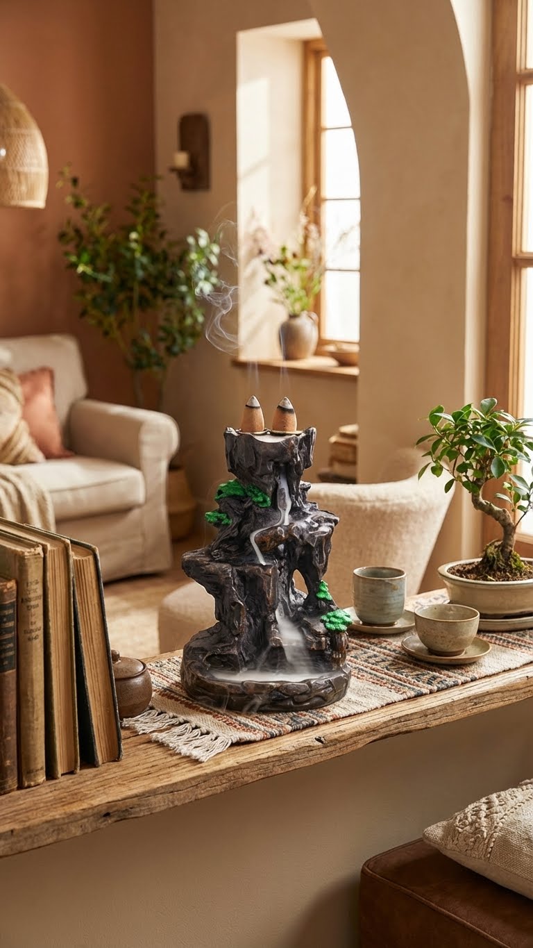 Que ce soit dans un coin méditatif, sur une étagère ou au cœur de votre salon, cette fontaine transformera instantanément l'ambiance. Elle invite au calme et à la contemplation, créant un point focal mystique et serein.